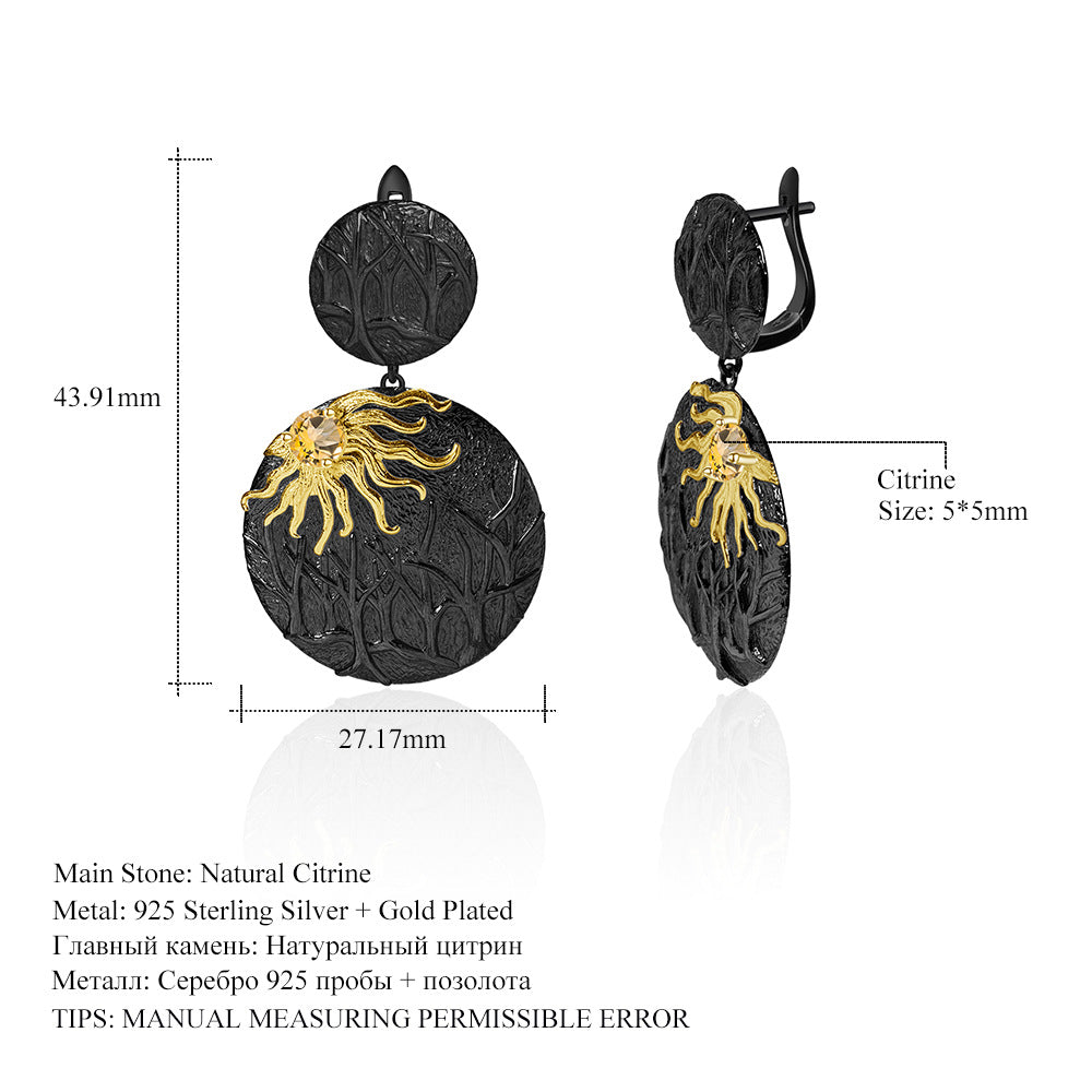 Designer! 925 silver natural citrine dark wind mountain and sea chasing sun design earrings
