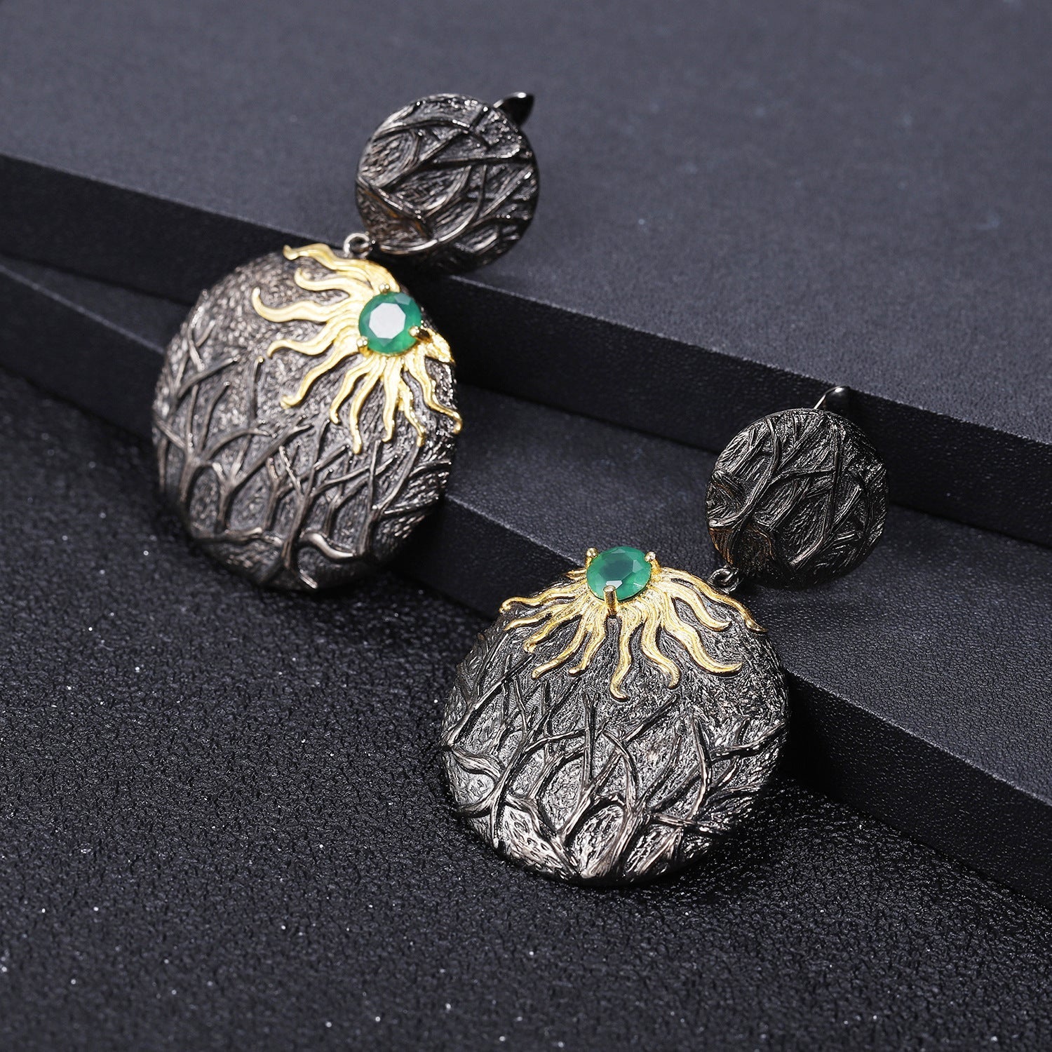 These designer earrings feature a bold and artistic “mountain and sea chasing the sun” design, crafted from 925 sterling silver with a striking blackened finish. The intricate detailing is complemented by a touch of gold-plated accents, highlighting the radiant natural citrine gemstone (5*5mm) that symbolizes the sun. Measuring 43.91mm in length and designed with textured surfaces resembling natural landscapes, these earrings exude a dark, mysterious charm while celebrating the beauty of nature. Perfect for those who love unique, statement jewelry, these earrings combine modern craftsmanship with timeless inspiration, making them a true standout piece.