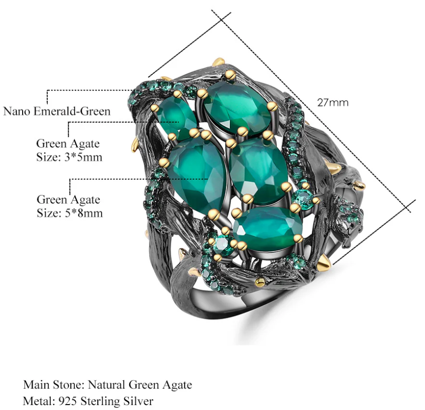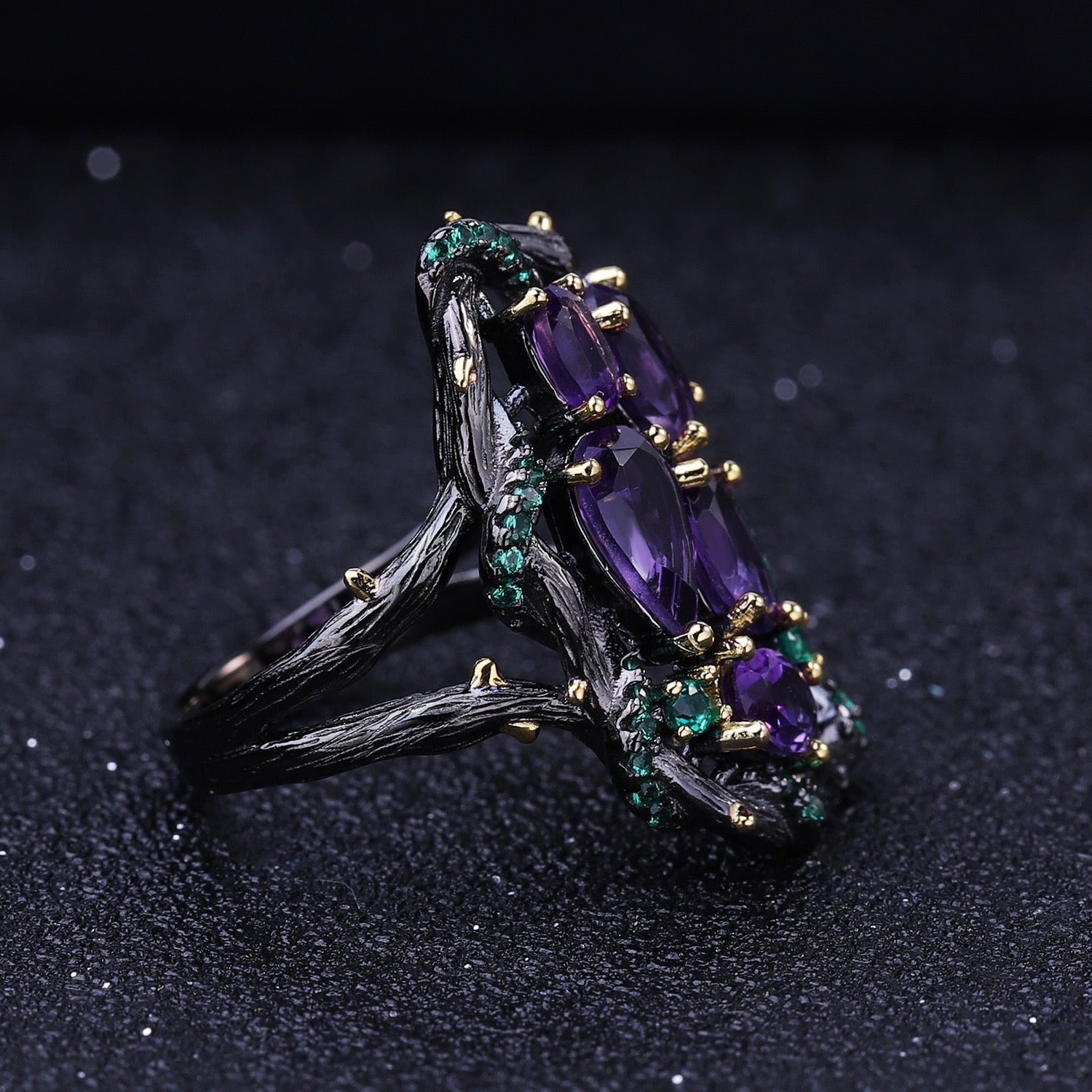 This designer Italian craft ring is a true masterpiece, crafted from 925 sterling silver with a unique dark finish that exudes elegance and sophistication. The ring is adorned with a stunning arrangement of natural colored gemstones, including vibrant amethysts (58mm and 35mm) and brilliant nano emerald-green accents, creating a striking contrast. Its intricate design, inspired by natural vines, highlights the craftsmanship and artistry of Italian jewelry design. With its bold 27mm width, this statement ring is perfect for those who appreciate luxurious, unique, and eye-catching accessories, making it a standout addition to any collection.