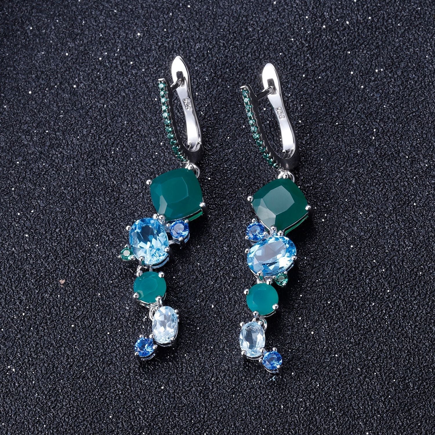 These designer earrings are a statement of elegance and sophistication, crafted from premium 925 sterling silver and adorned with a stunning selection of natural colored gemstones. The vibrant palette features mystic quartz, Swiss blue topaz, sky blue topaz, nano sapphire blue, and nano emerald green, arranged in a cascading design that accentuates their brilliance. Measuring 55mm in length, the earrings exude timeless luxury and are perfect for formal occasions or banquets. Their exquisite craftsmanship and harmonious color combination make them a standout accessory, elevating any outfit with a touch of refined glamour.