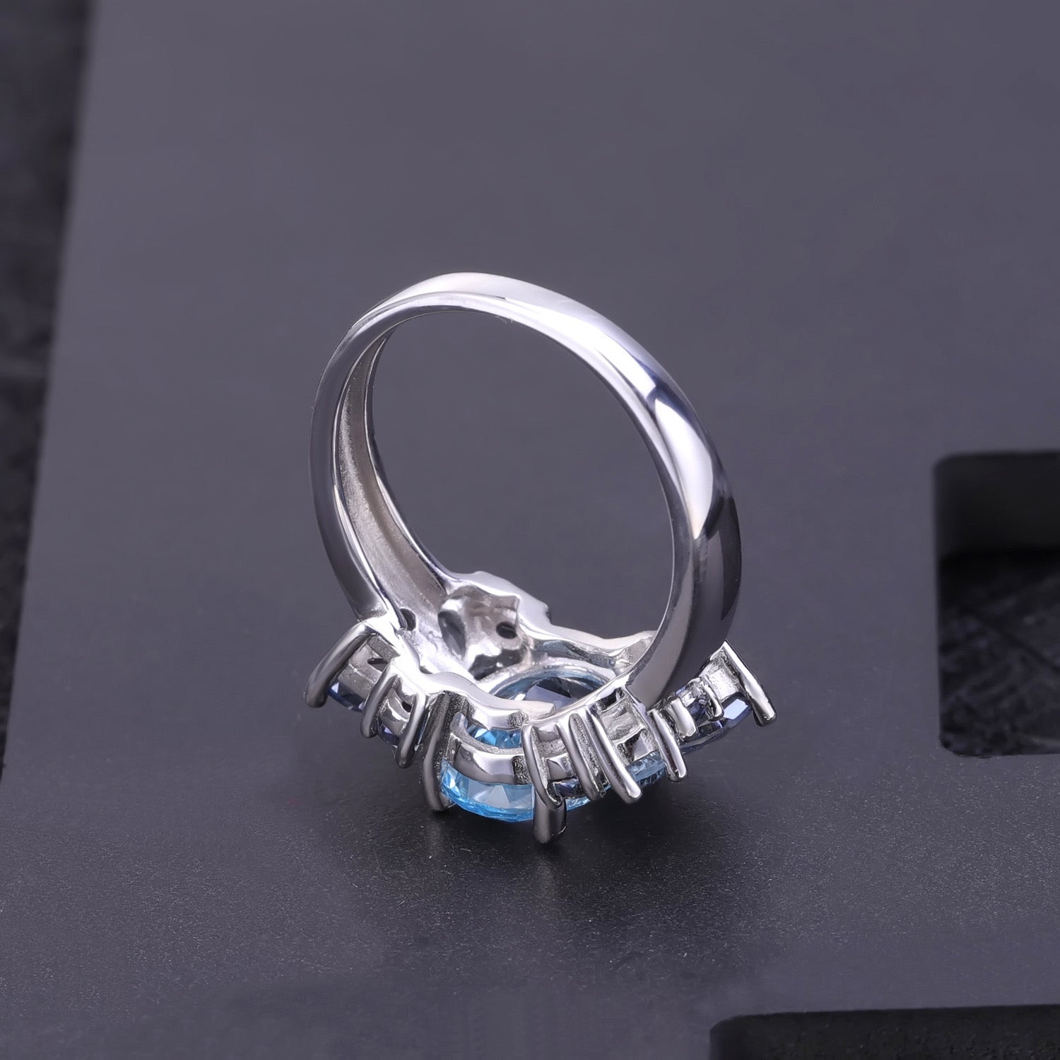 This designer original ring showcases a unique blend of elegance and sophistication, crafted from high-quality 925 sterling silver. The centerpiece features a stunning natural sky blue topaz gemstone (810mm, 3.47Ct each), surrounded by an exquisite arrangement of smaller mystic quartz (36mm) and sky blue topaz accents (35mm and 36mm). The intricate prong setting enhances the brilliance of each gemstone, creating a dazzling and harmonious composition. Perfect for formal occasions or as a statement accessory, this ring highlights superior craftsmanship and timeless design, making it a luxurious addition to any jewelry collection.
